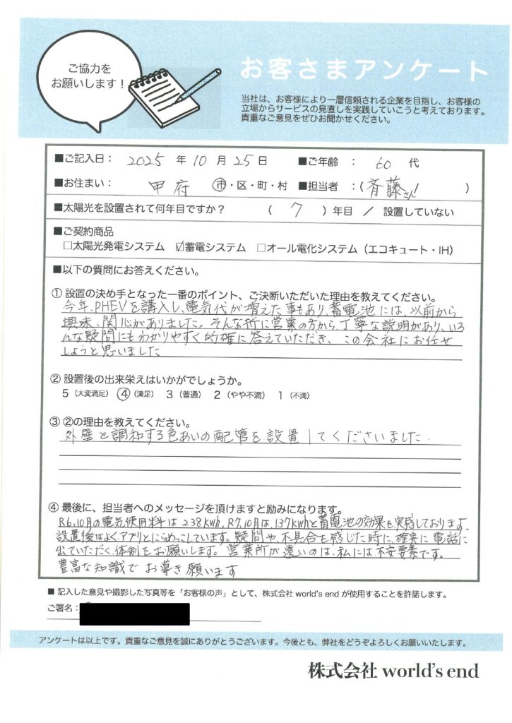 蓄電池 山梨県甲府市O様邸:DMM 2026.03.09 お客様施工事例:山梨県甲府市 O様邸 お客様の声 この度は蓄電池の導入ありがとうございます。 商談時はご子息様も一緒にお話を聞いてくださり、O様邸の皆様にとって良いご提案ができて良かったです。 今後とも宜しくお願い致します。 山梨県甲府市M様邸:DMM 前の記事 山梨県甲府市O様邸:DMM 次の記事
